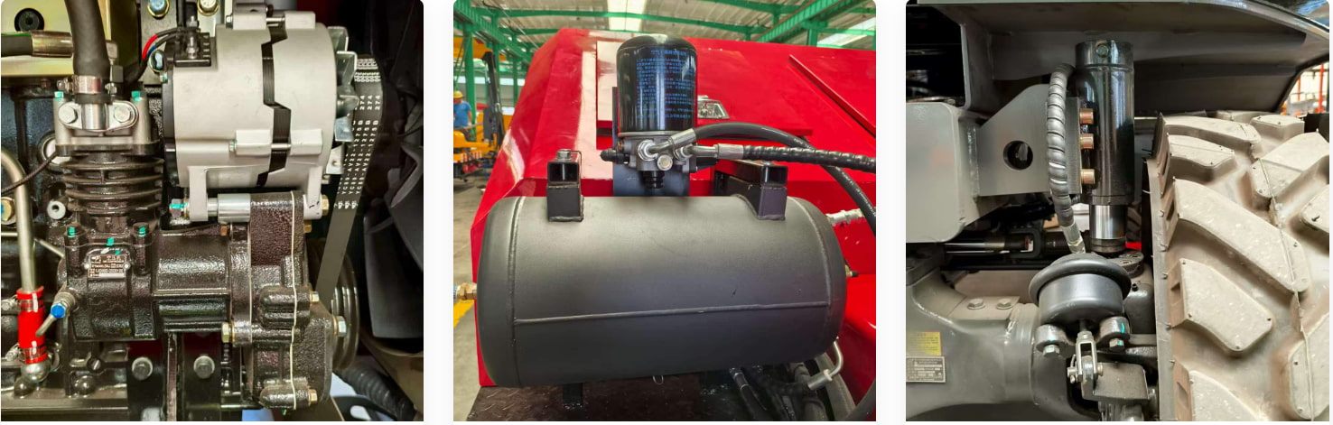 Un petit compresseur d'air indépendant assure une alimentation en air stable et un fonctionnement fiable du système de freinage. Un réservoir d'air comprimé complète ce dispositif ; il stocke l'air comprimé, stabilise la pression pendant le fonctionnement de l'équipement, réduit les fluctuations de pression dues aux arrêts et redémarrages fréquents du compresseur et fournit une source d'air stable pour le système pneumatique.